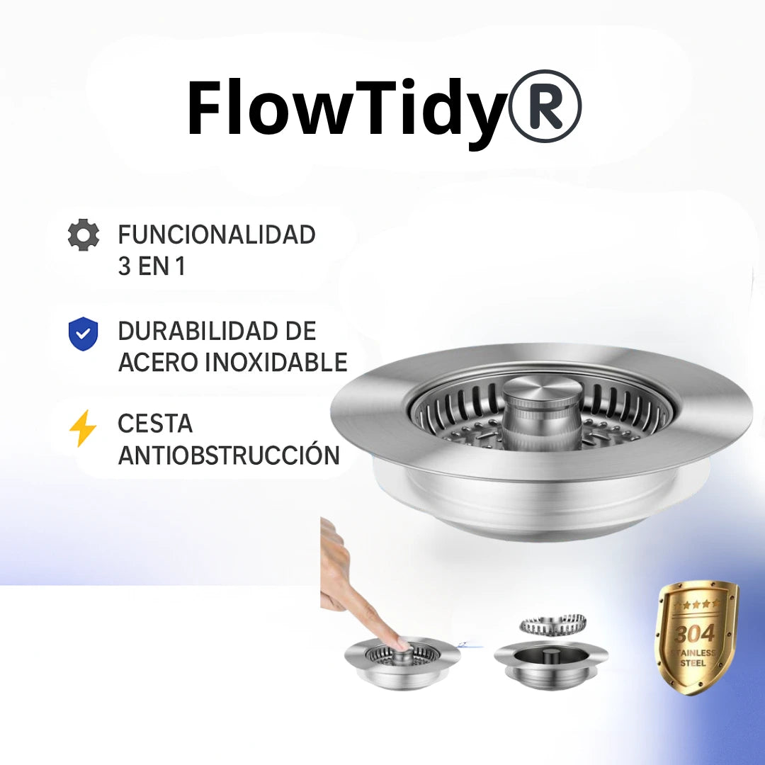 Descubre el poder de FLOWTIDY 3 en 1, que evita atascos con una cesta coladora de acero inoxidable que captura los residuos antes de que se vuelvan un problema.